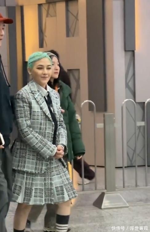 她顶着极短的绿色寸头,发色鲜艳夺目,略显干枯的发质在光线照射下仿佛戴上了一顶不合尺寸的假发套,有网友打趣称:“第一眼还以为是金龟子进城了。”